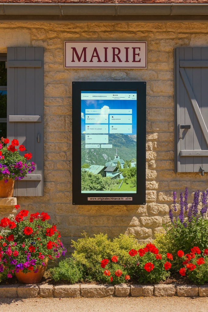 Offrez à vos administrés une expérience d’information moderne, intuitive et accessible, tout en répondant à vos obligations légales. Nos dispositifs associent écran tactile interactif pour information légale et panneau d’information numérique pour l’affichage des informations municipales au quotidien :